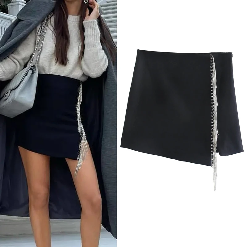 Женская короткая юбка с высокой талией, черная Осенняя мини-юбка с драгоценными камнями и разрезом, Y2K, 2021