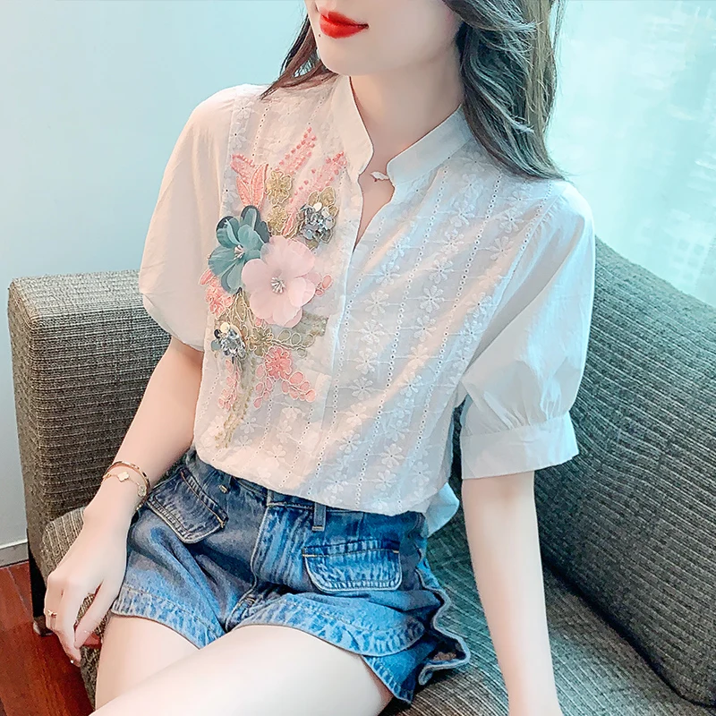 Женская кружевная блузка в стиле ретро, белая рубашка с V-образным вырезом, коротким рукавом и цветочной вышивкой, лето 2022