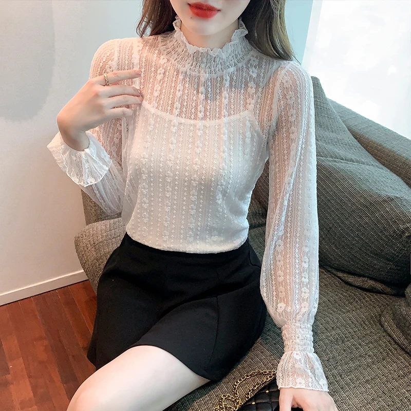 Женская кружевная блузка с длинным рукавом, Облегающая белая блузка с полувысоким воротником, весна 2022