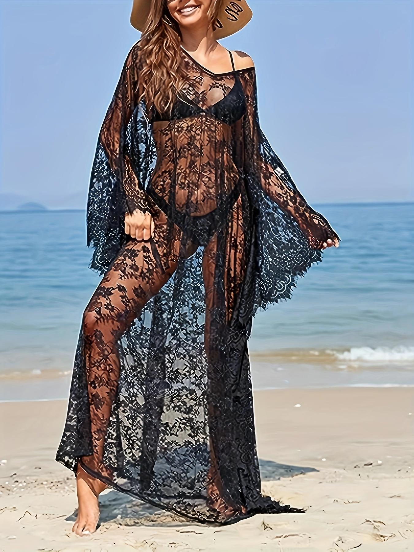 Женская кружевная накидка в стиле бохо с рукавами «летучая мышь», модная повседневная пляжная одежда, размер плюс One-size чёрный