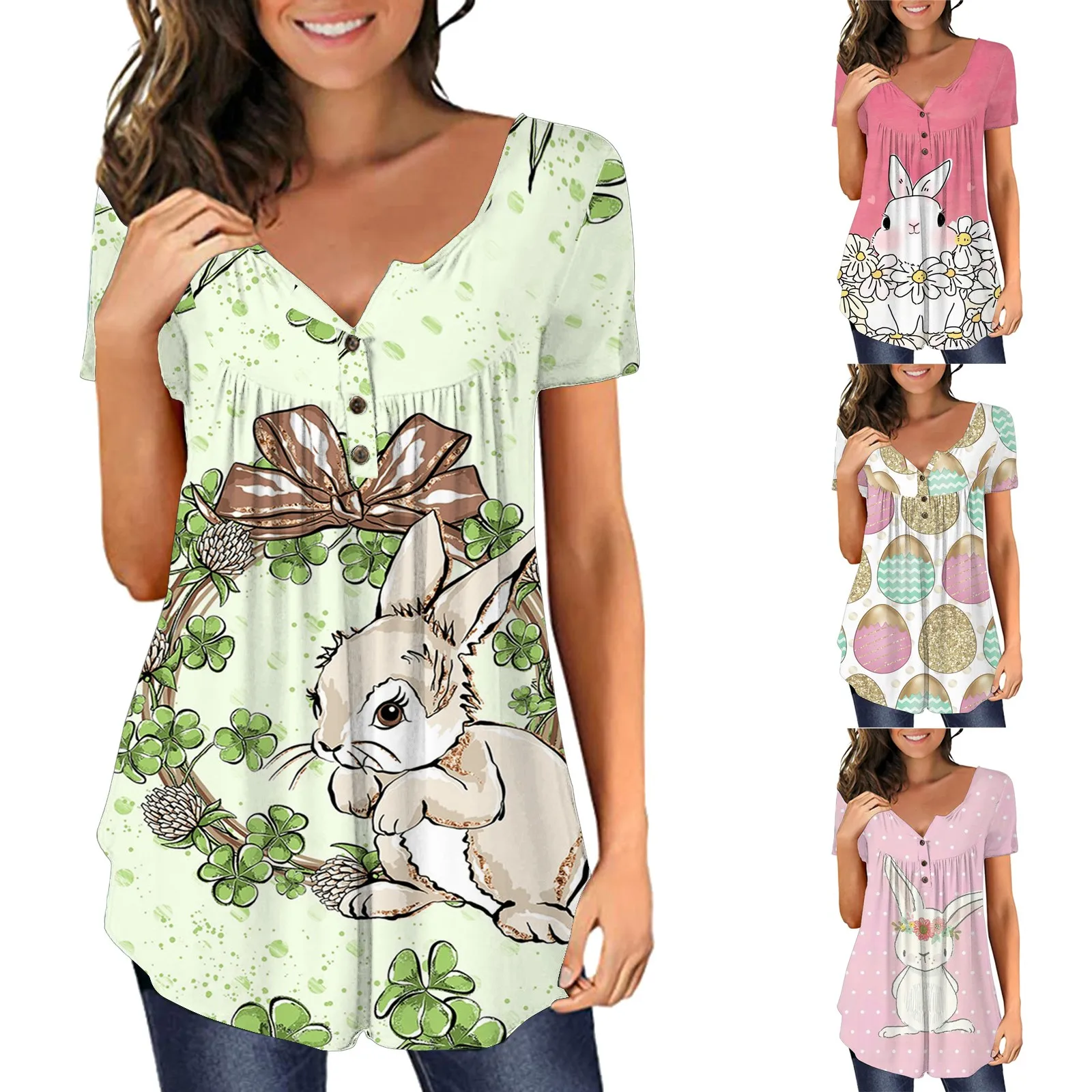 Женская летняя блузка с коротким рукавом, V-образным вырезом и принтом