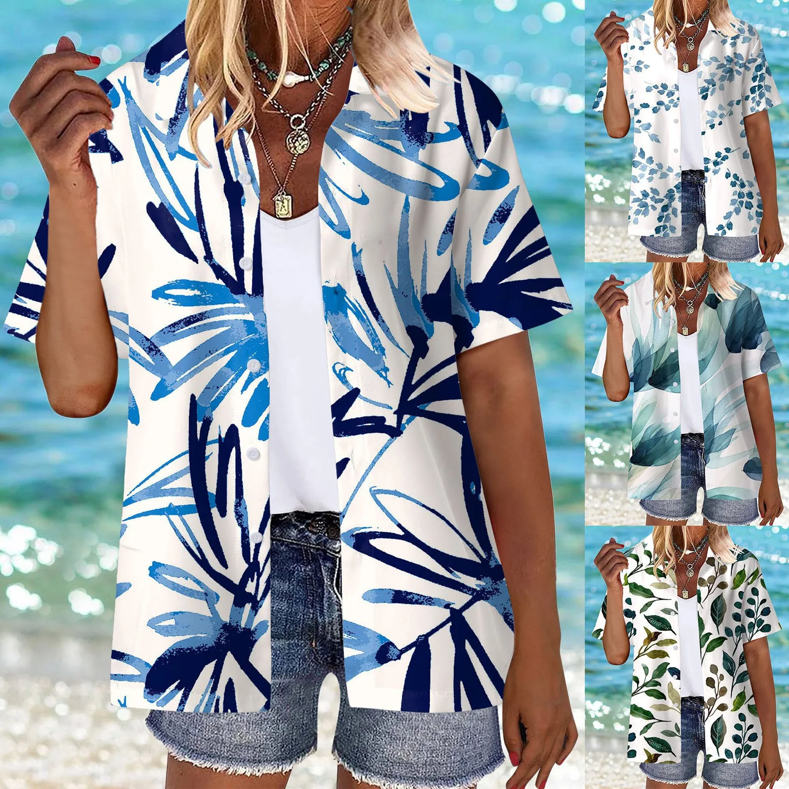 Женская летняя блузка с цветочным принтом, коротким рукавом и пуговицами
