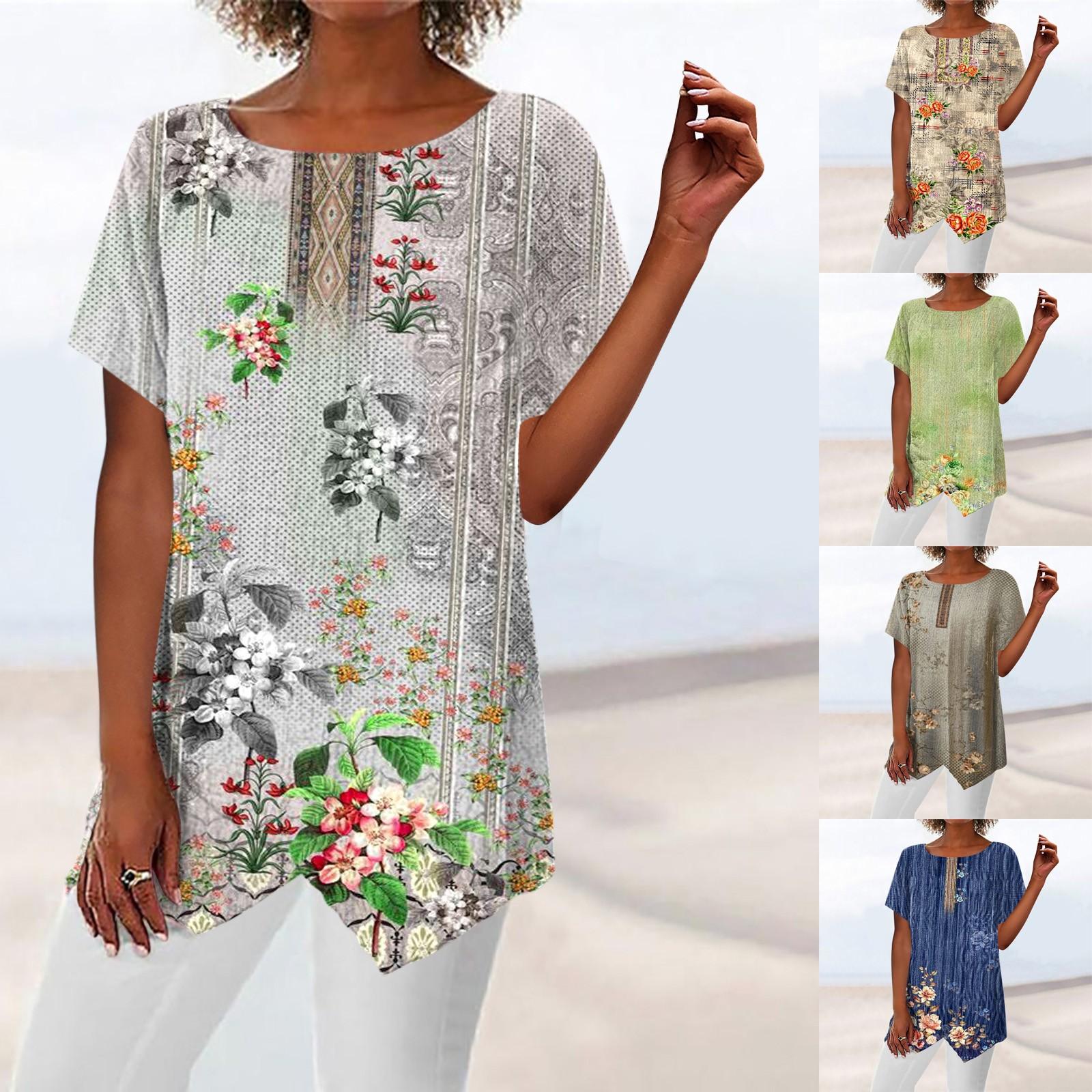 Женская летняя рубашка-блузка с принтом и коротким рукавом, повседневная базовая футболка с круглым вырезом и нерегулярным подолом