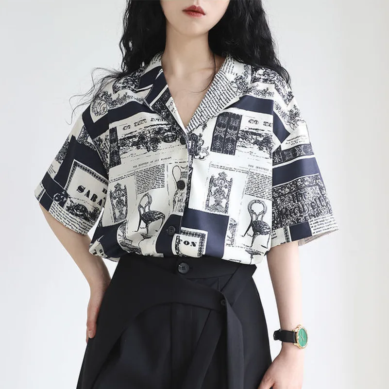 Женская летняя рубашка на пуговицах, блузка с принтом в винтажном стиле, тонкая шифоновая блузка с коротким рукавом, 2022
