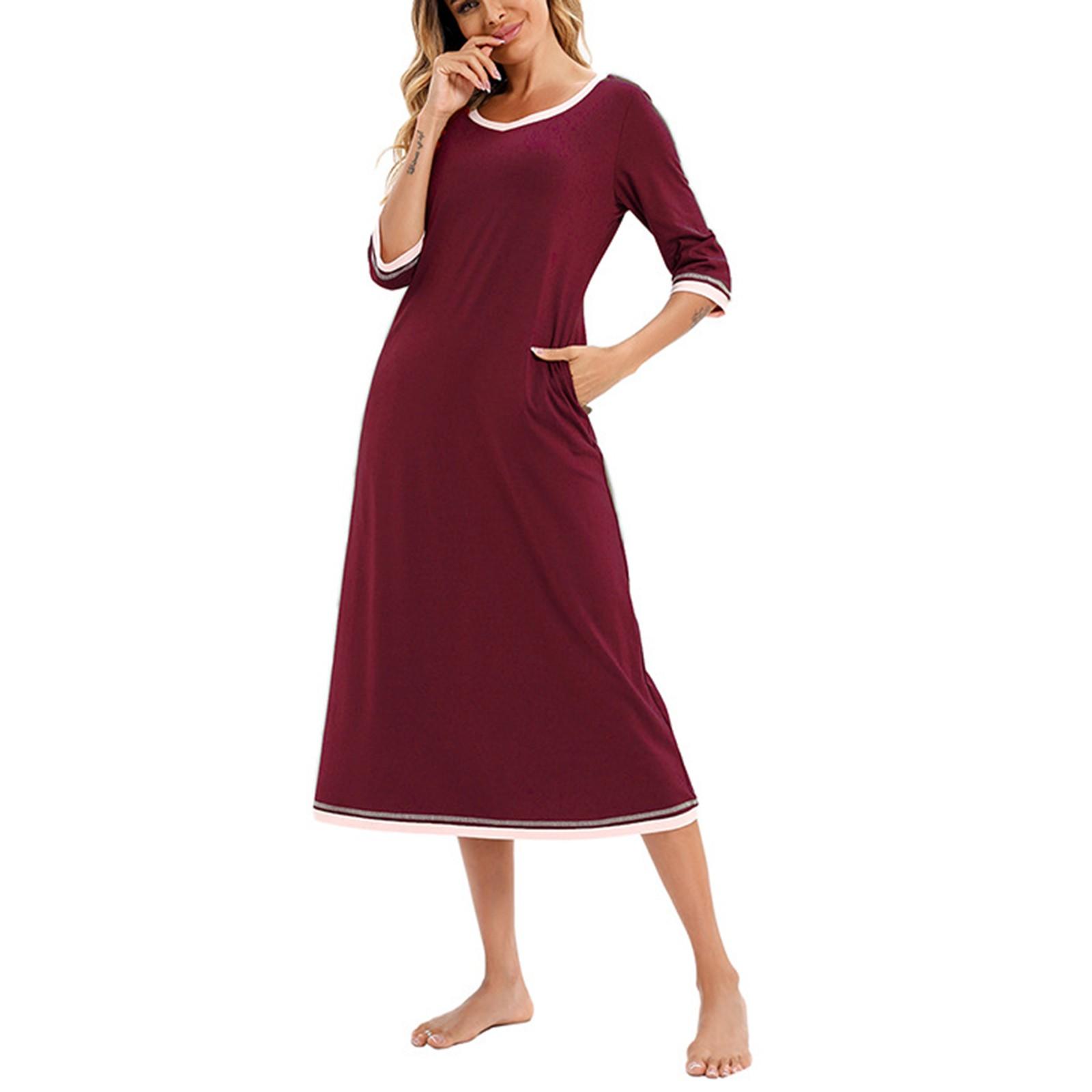 Женская летняя свободная длинная рубашка с V-образным вырезом, цветные блоки, рукав семь четвертей, без карманов, платья для дома и отдыха XL винный
