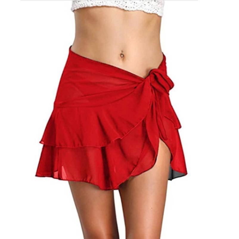 Женская летняя сексуальная пляжная юбка с рюшами, шифоновое короткое купальное платье для плавания красный