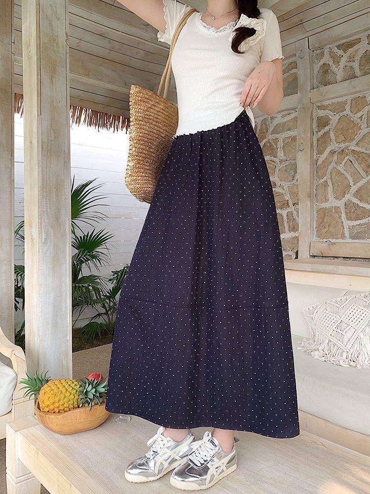 Женская летняя французская юбка миди А-силуэта в горошек – Стройнящая и драпирующаяся, в стиле феи-принцессы Large тёмно-синий/чёрный