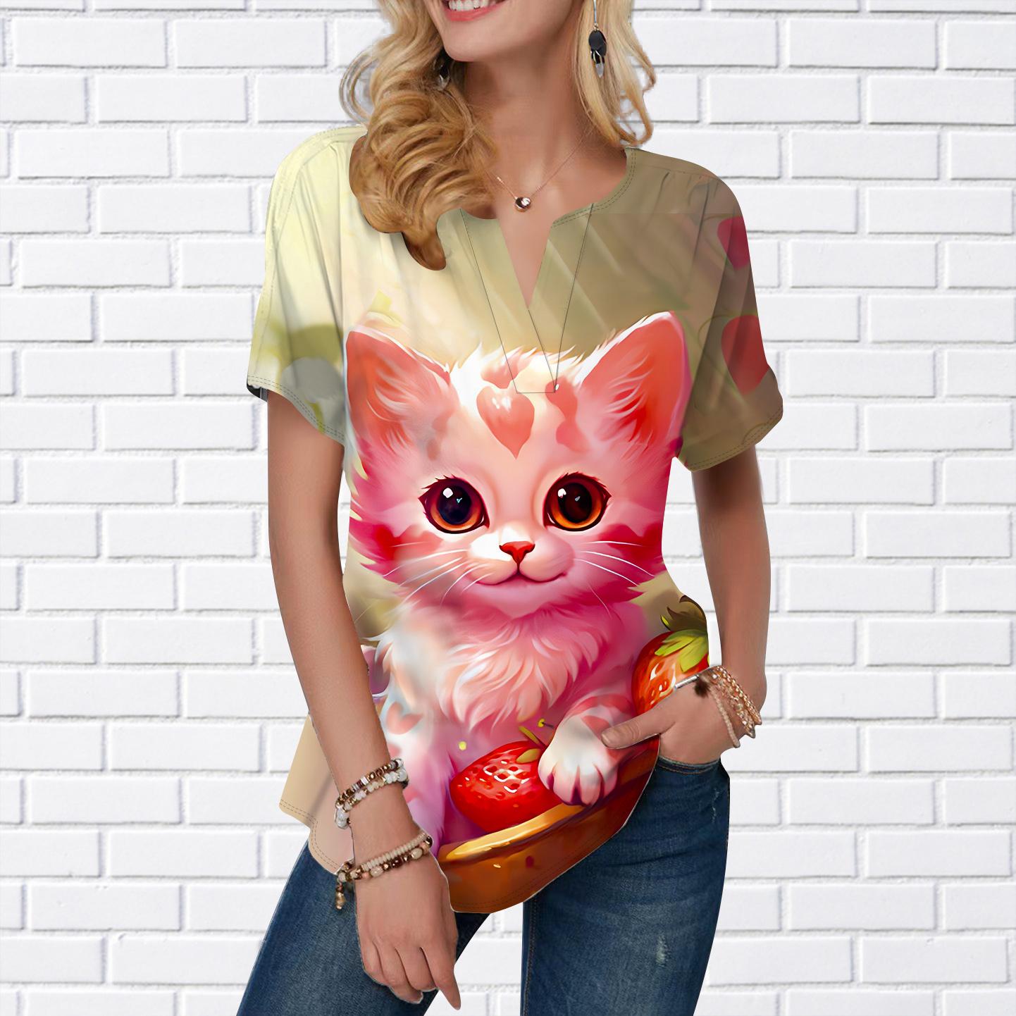Женская летняя футболка с принтом фруктового кота, футболки с короткими рукавами, повседневные топы с принтом, маленький v-образный вырез с короткими рукавами 8XL дубильная кора