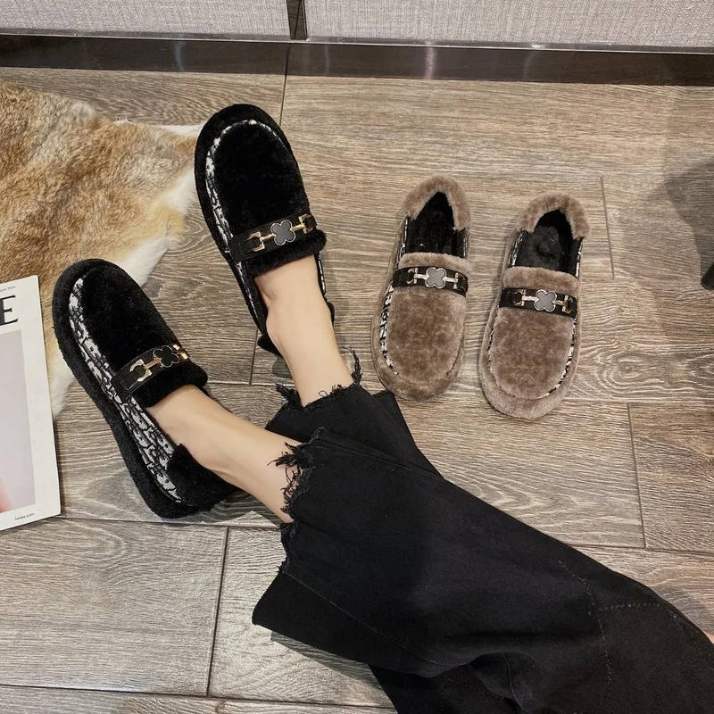 Женская меховая обувь, модная новинка 2021, осенне-зимняя повседневная флисовая обувь на одной ноге с металлической пряжкой