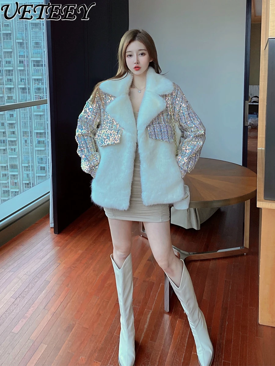 Женская меховая одежда, зимняя Новинка, модное свободное облегающее пальто средней длины с блестками и утепленным мехом норки