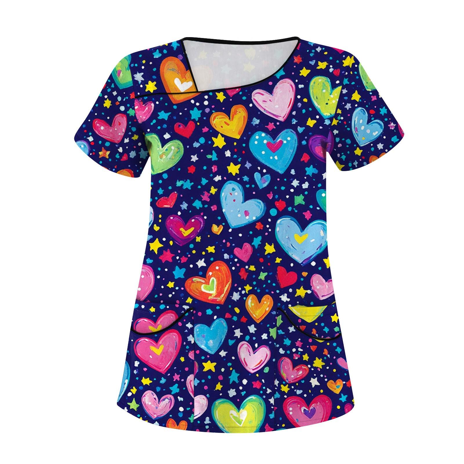 Женская мода День святого Валентина Любовь Печатный короткий рукав Уход за рабочей одеждой с двойными карманами Топ L синий