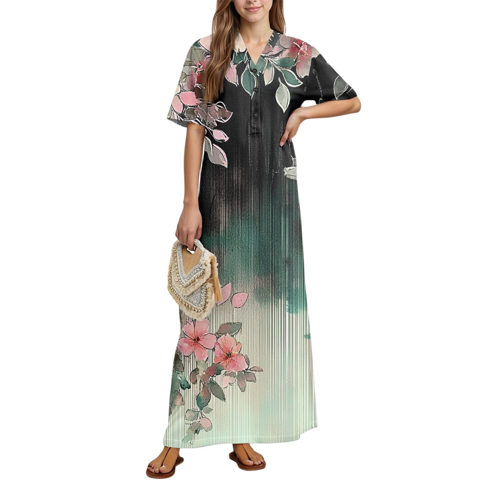Женская мода Принтованная ночная сорочка Домашняя одежда Ночная сорочка с коротким рукавом с карманами Длинное платье L темно-зеленого