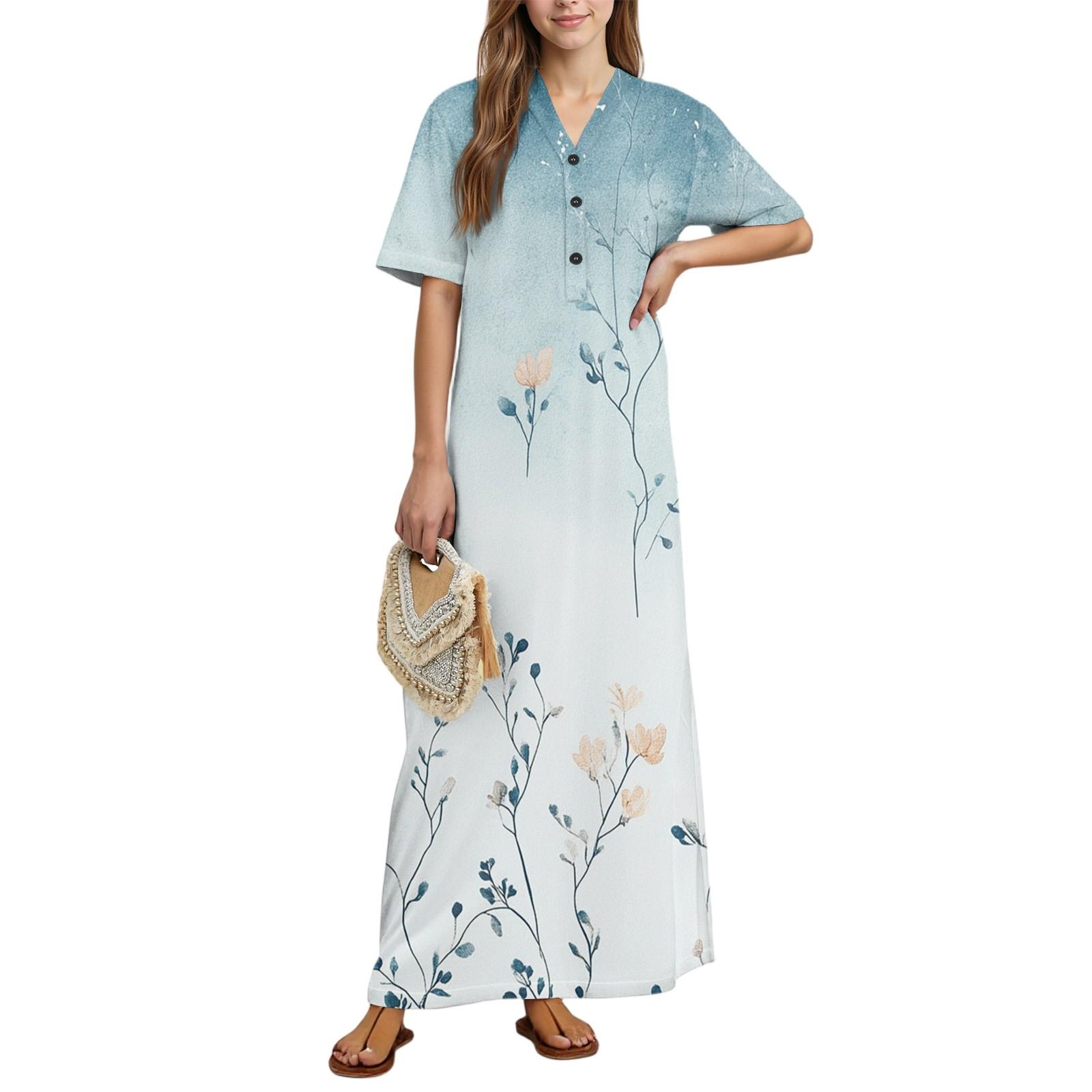 Женская мода Принтованная ночная сорочка Домашняя одежда Ночная сорочка с коротким рукавом с карманами Длинное платье XL белый