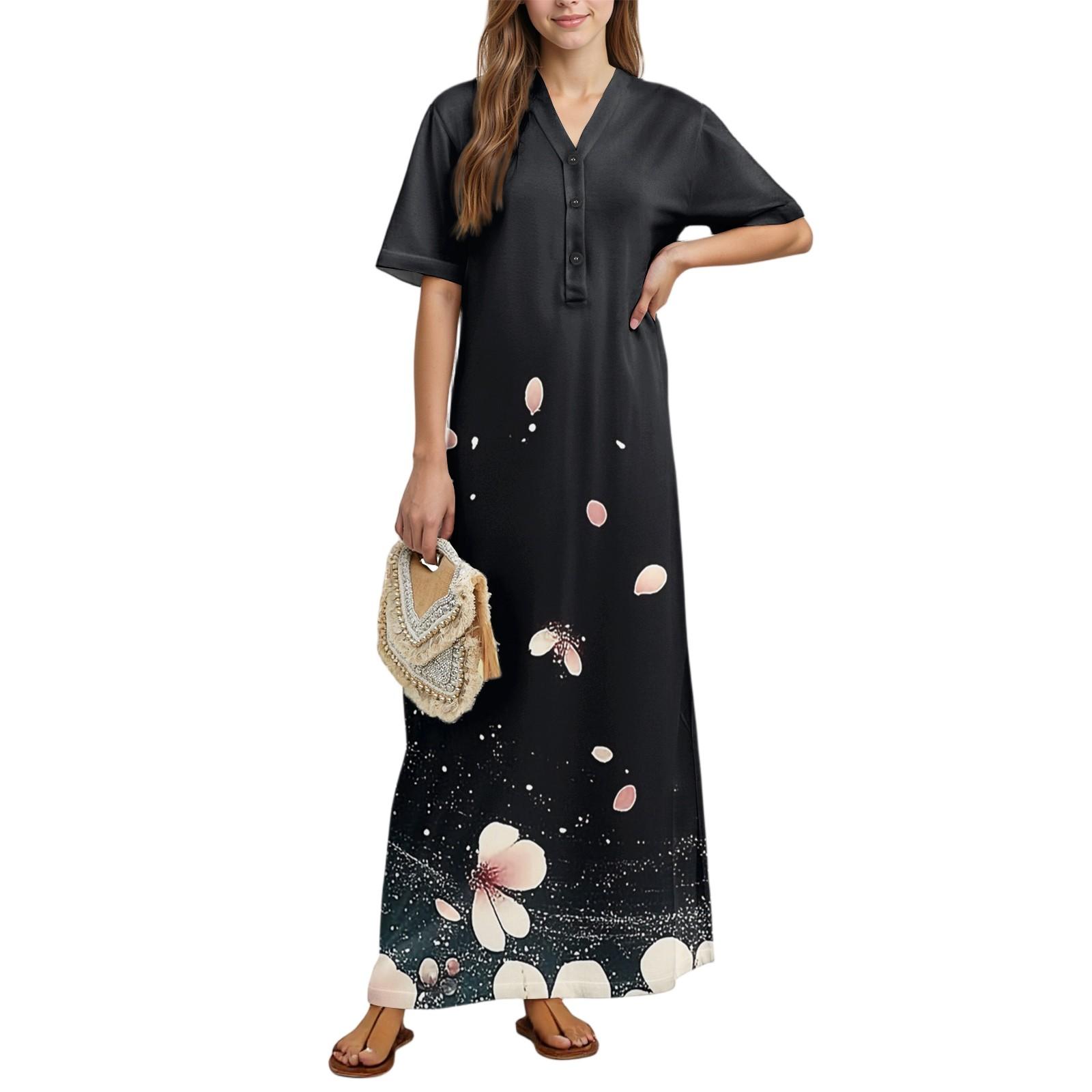 Женская мода Принтованная ночная сорочка Домашняя одежда Ночная сорочка с коротким рукавом с карманами Длинное платье XXL чёрный
