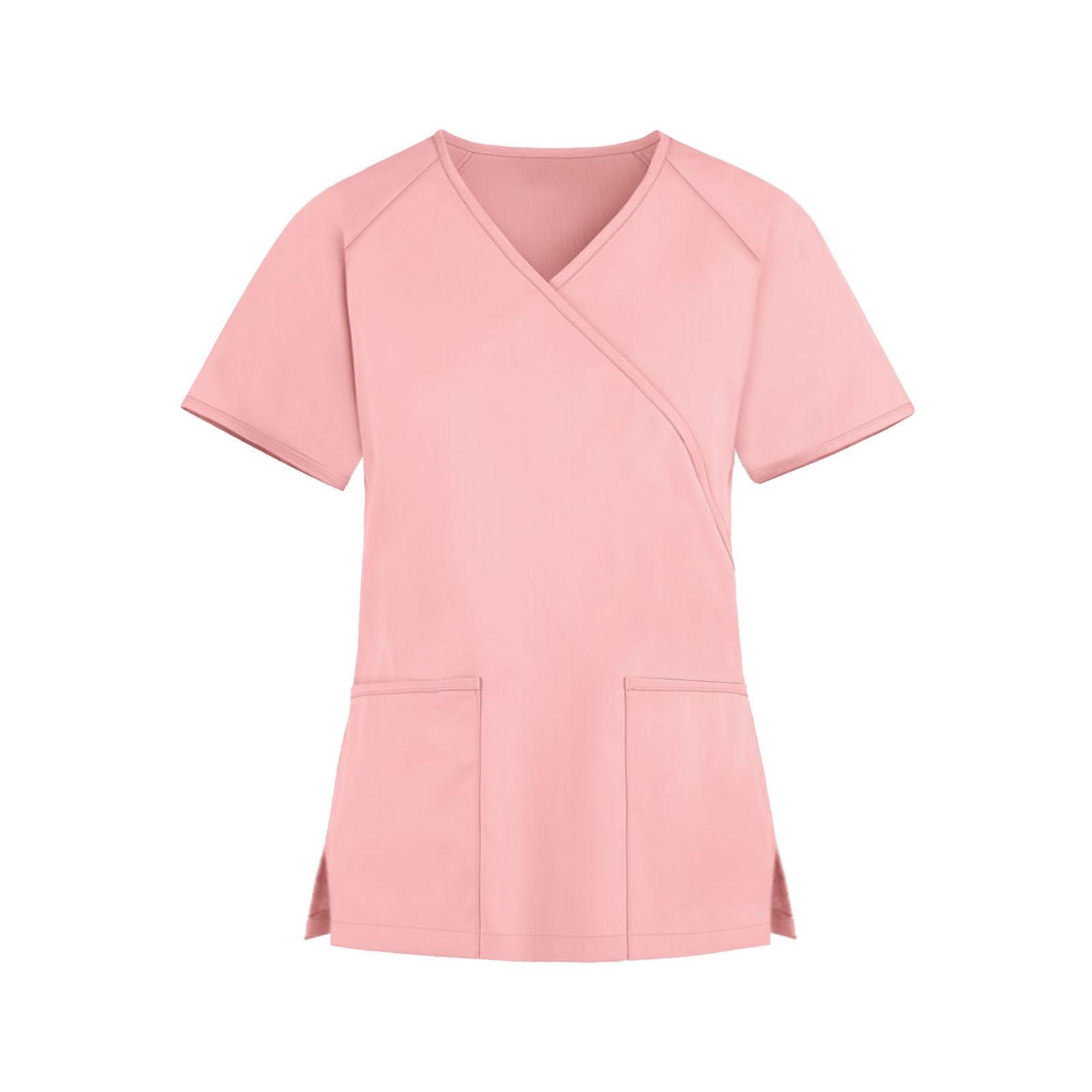 Женская мода однотонная рабочая одежда с v-образным вырезом и короткими рукавами с карманами, топы L розовый