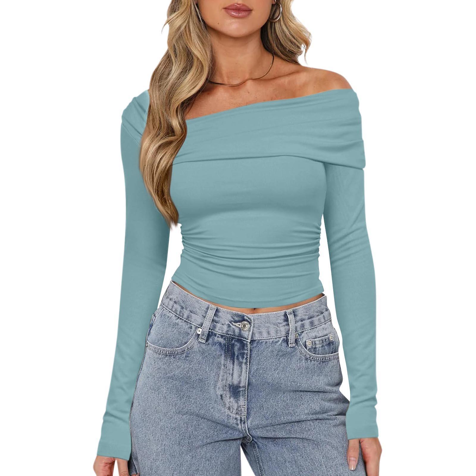 Женская мода, однотонный плиссированный топ на одно плечо с длинными рукавами, облегающий короткий топ с открытым пупком S синий