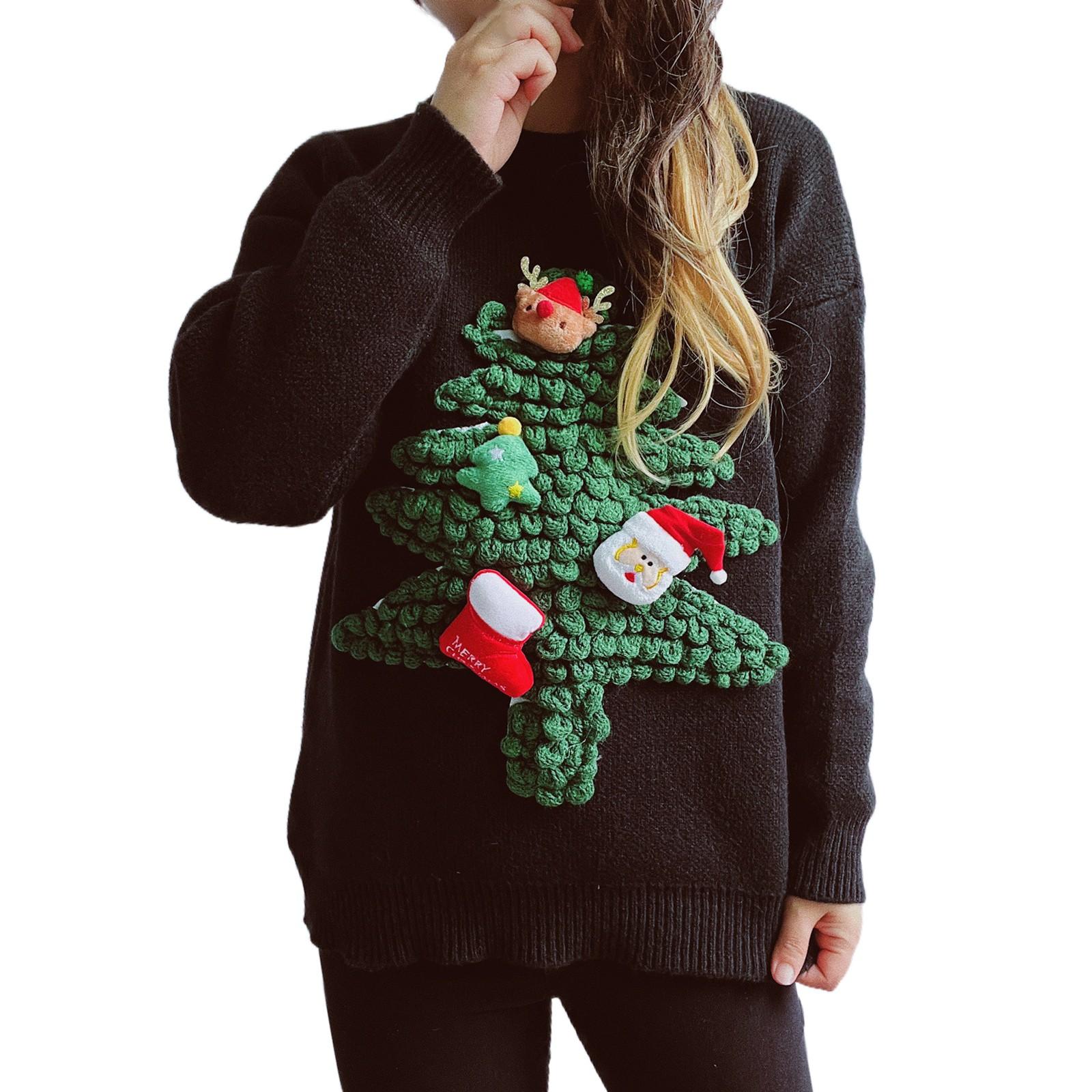 Женская мода осень и зима рождественский свободный круглый вырез пуловер вязаный свитер XL чёрный