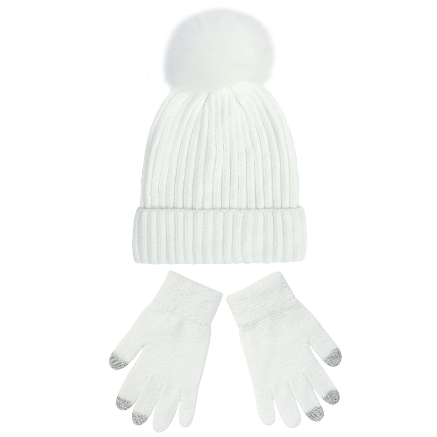 Женская мода осень-зима теплая шапка и перчатки комплект утолщенная теплая вязаная шерстяная шапка с помпоном комплект белый
