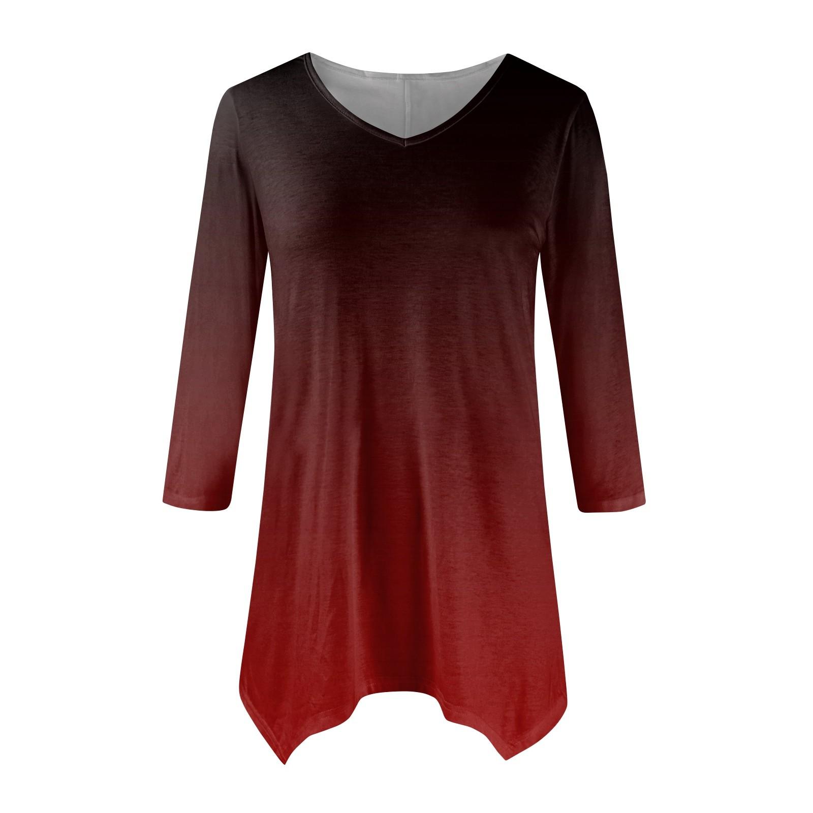 Женская мода повседневная рубашка с V-образным вырезом и постепенным принтом, рукава семь точек, свободный удобный топ с поясом XL винный