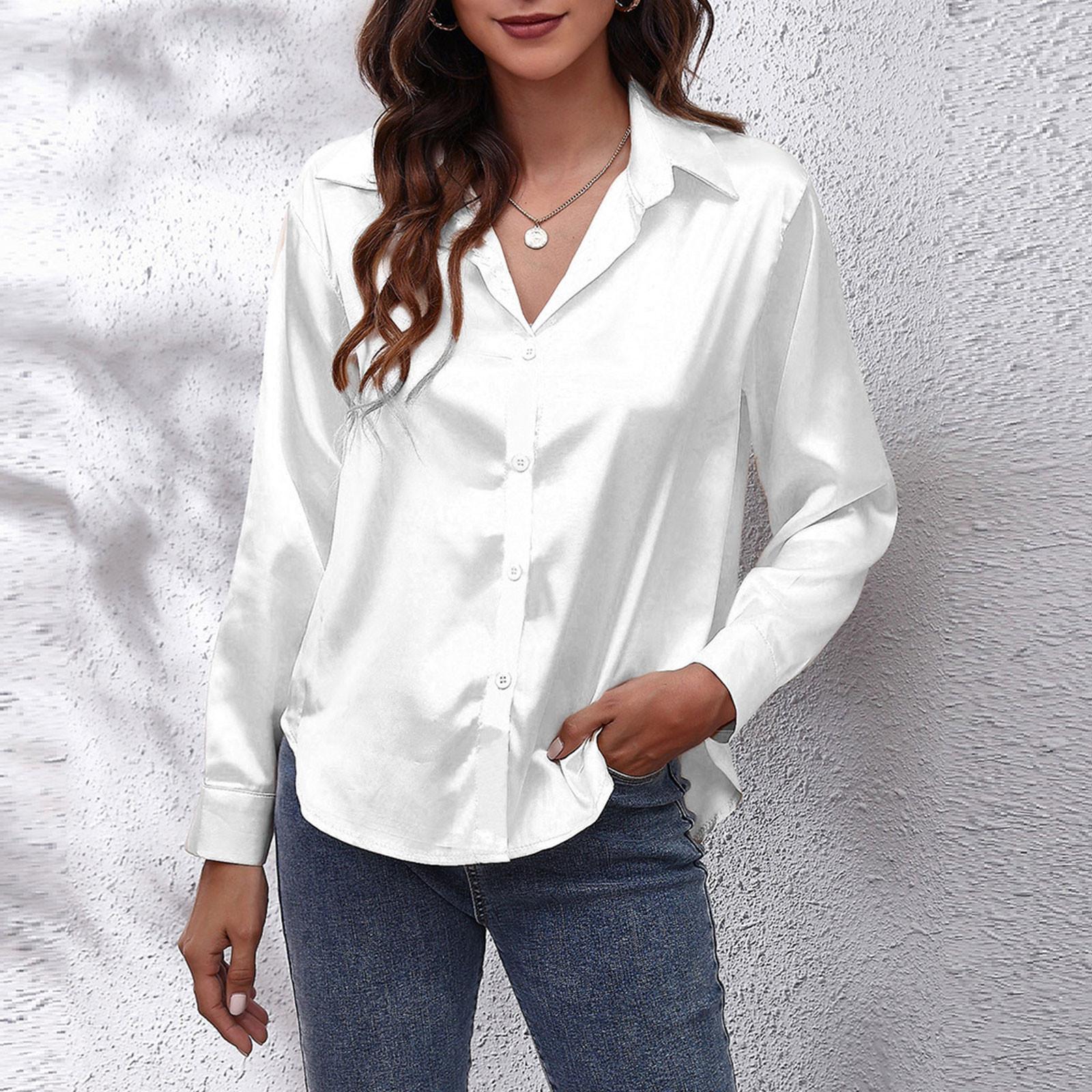 Женская мода, повседневная рубашка с v-образным вырезом, однотонная атласная рубашка с длинными рукавами и имитацией шелка на пуговицах XL белый