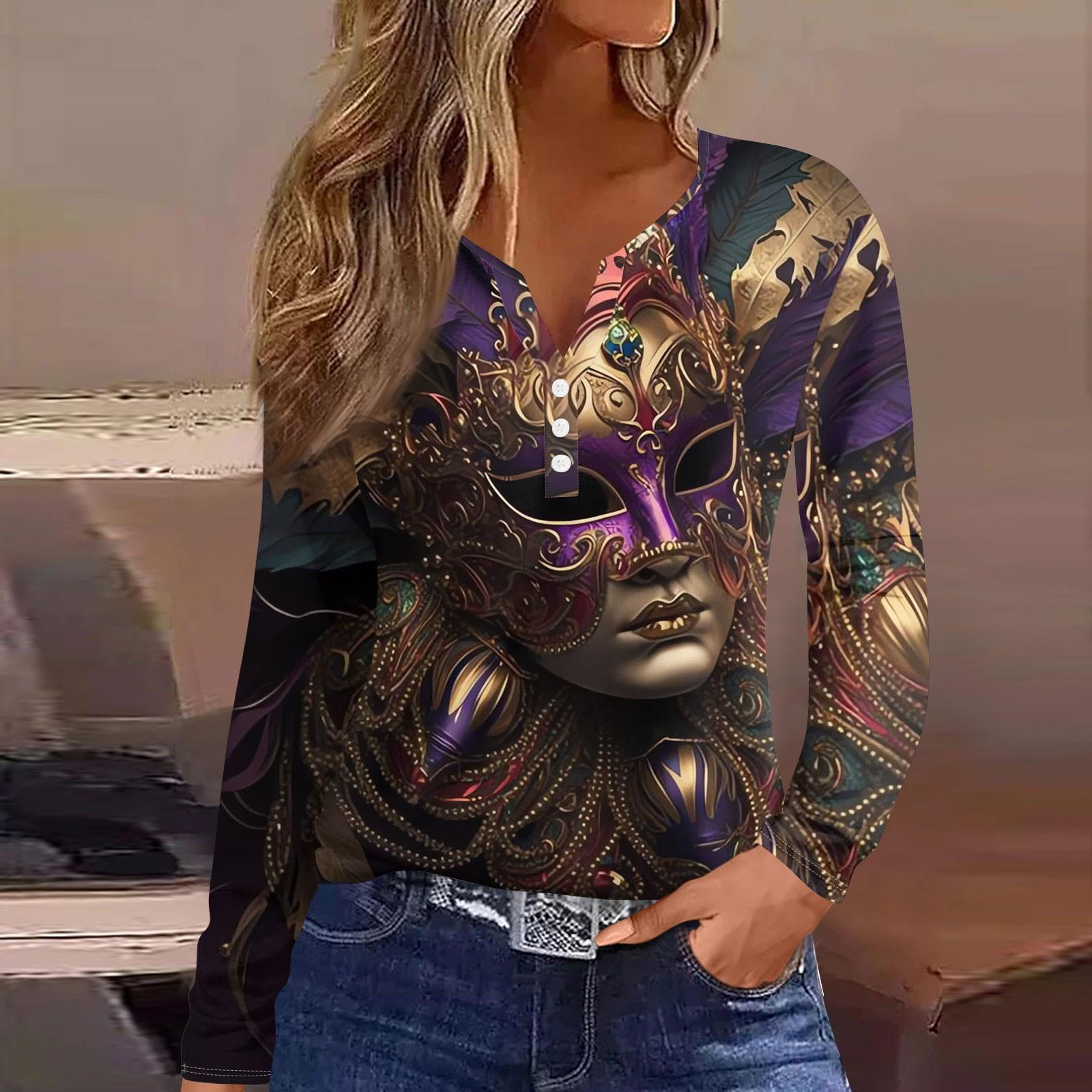 Женская мода повседневная футболка с принтом Марди Гра и V-образным вырезом, длинным рукавом, на пуговицах XXL