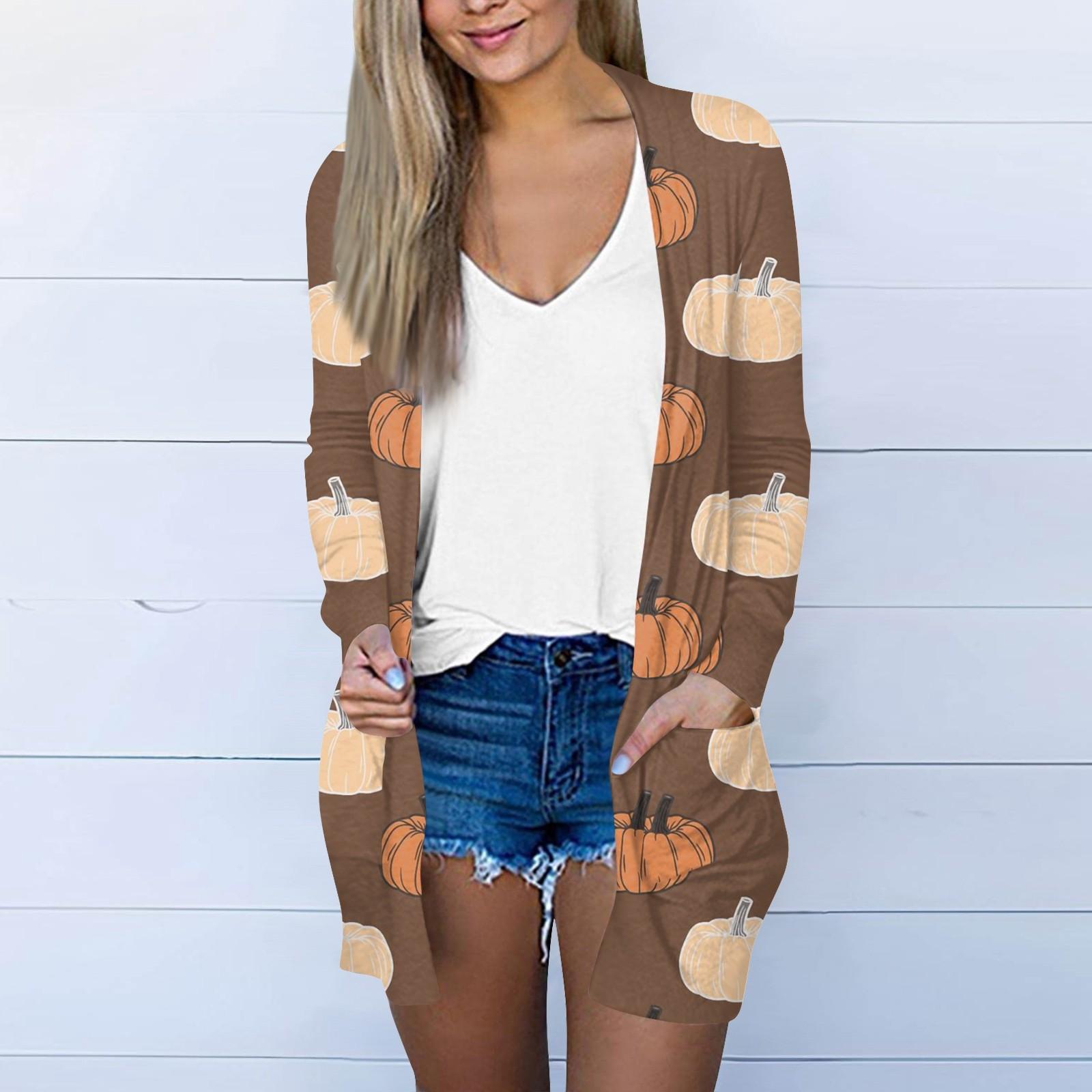 Женская мода, повседневный кардиган с карманом и принтом на Хэллоуин, средней длины L хаки