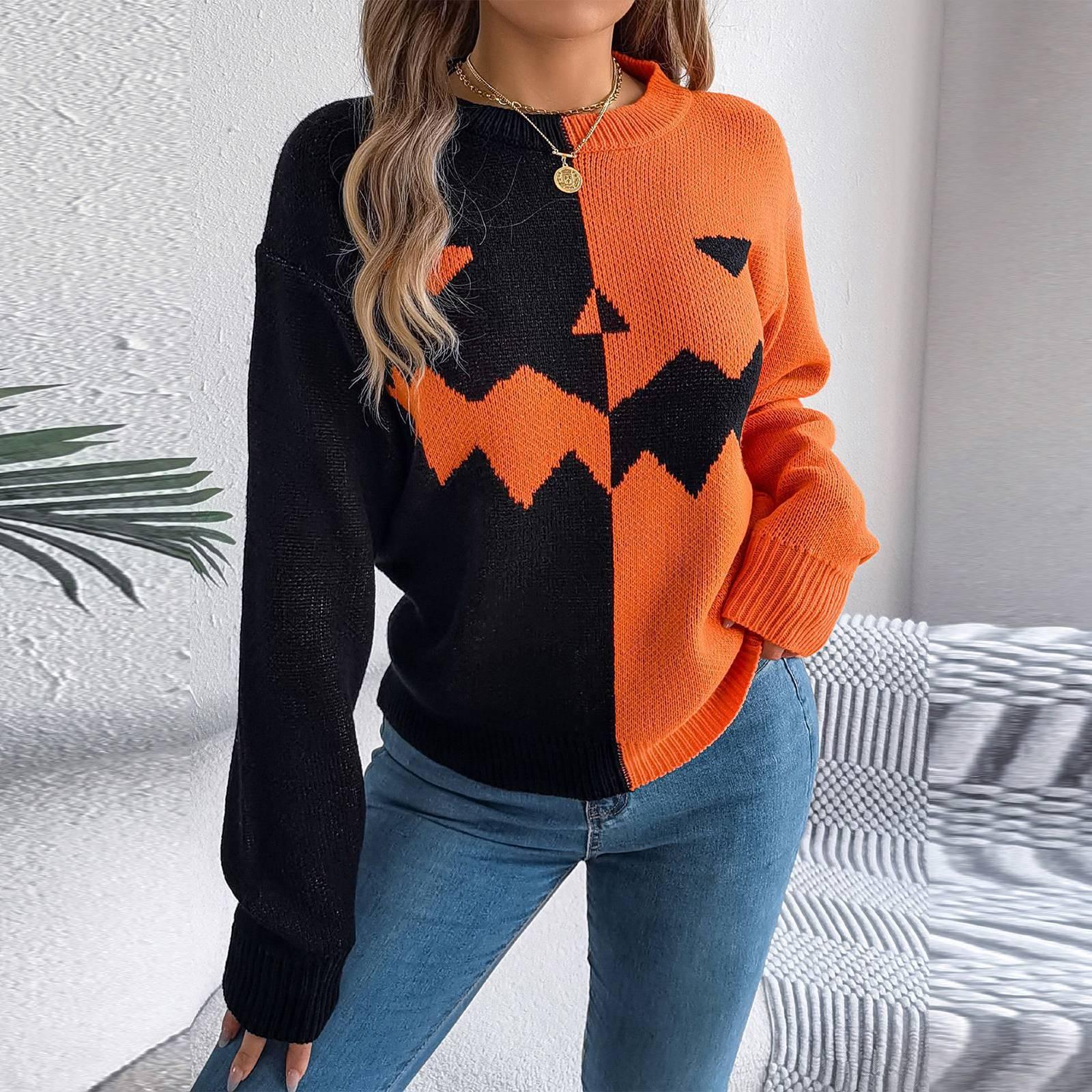 Женская мода повседневный свободный свитер контрастного цвета на Хэллоуин с длинным рукавом пуловер топ S оранжевый