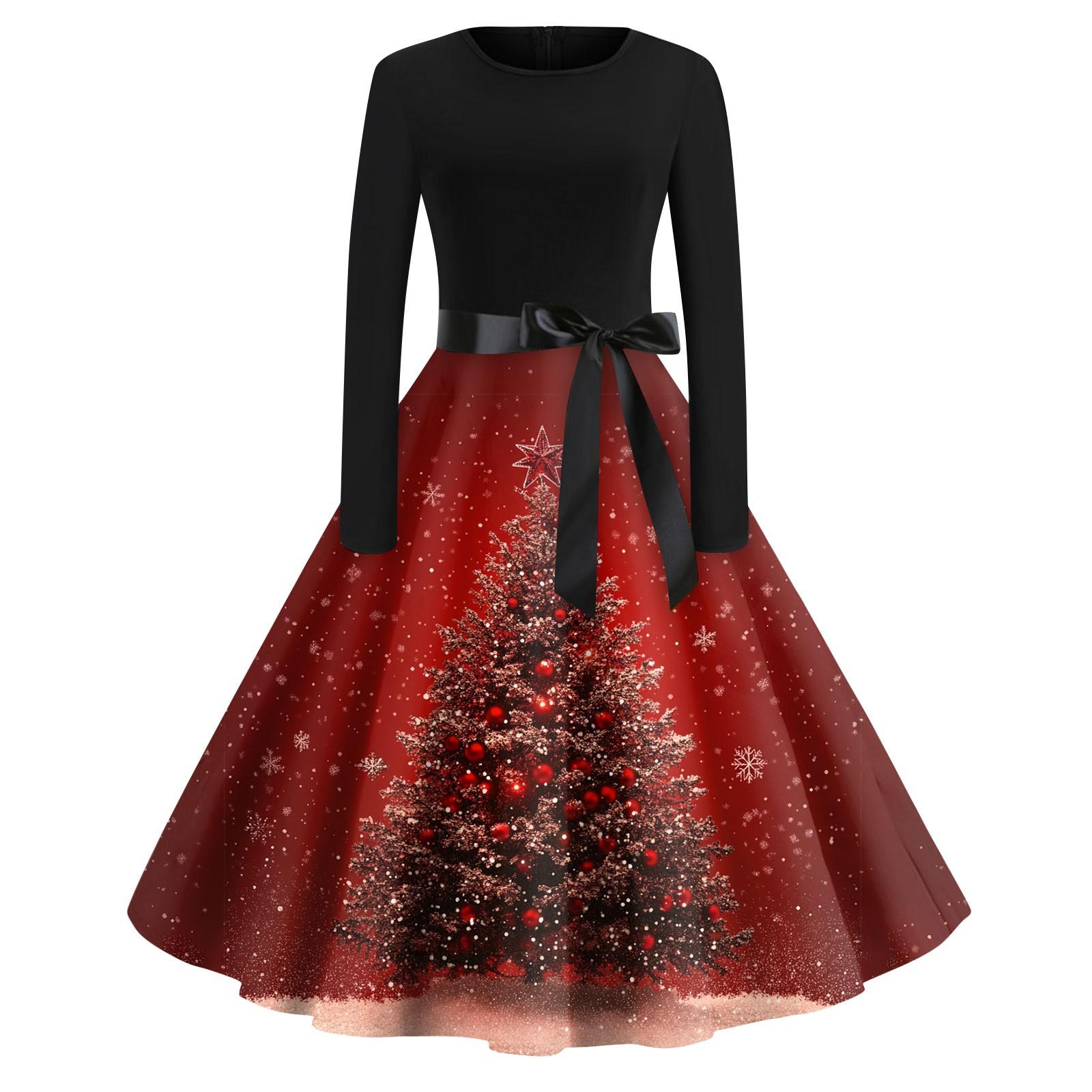 Женская мода с круглым вырезом, повседневные тонкие рождественские платья с длинным рукавом и принтом XL винный