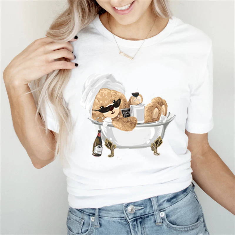 Женская модная Милая Повседневная футболка 90-х с коротким рукавом, топ, летняя футболка с принтом маленького медведя, женская футболка с принтом.