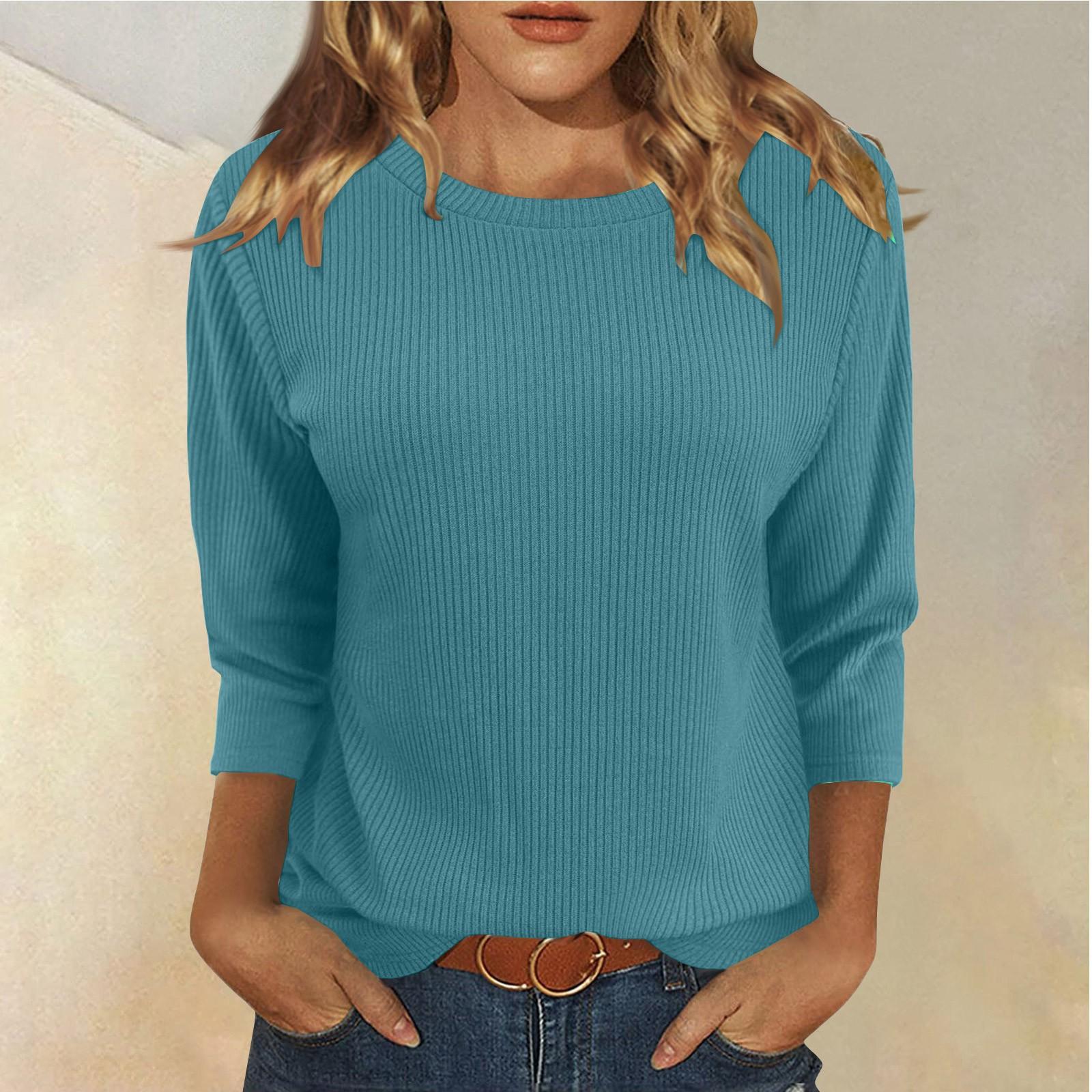 Женская модная осенне-зимняя повседневная футболка с круглым вырезом и рубчиком, однотонная, с рукавом три четверти, женская одежда L