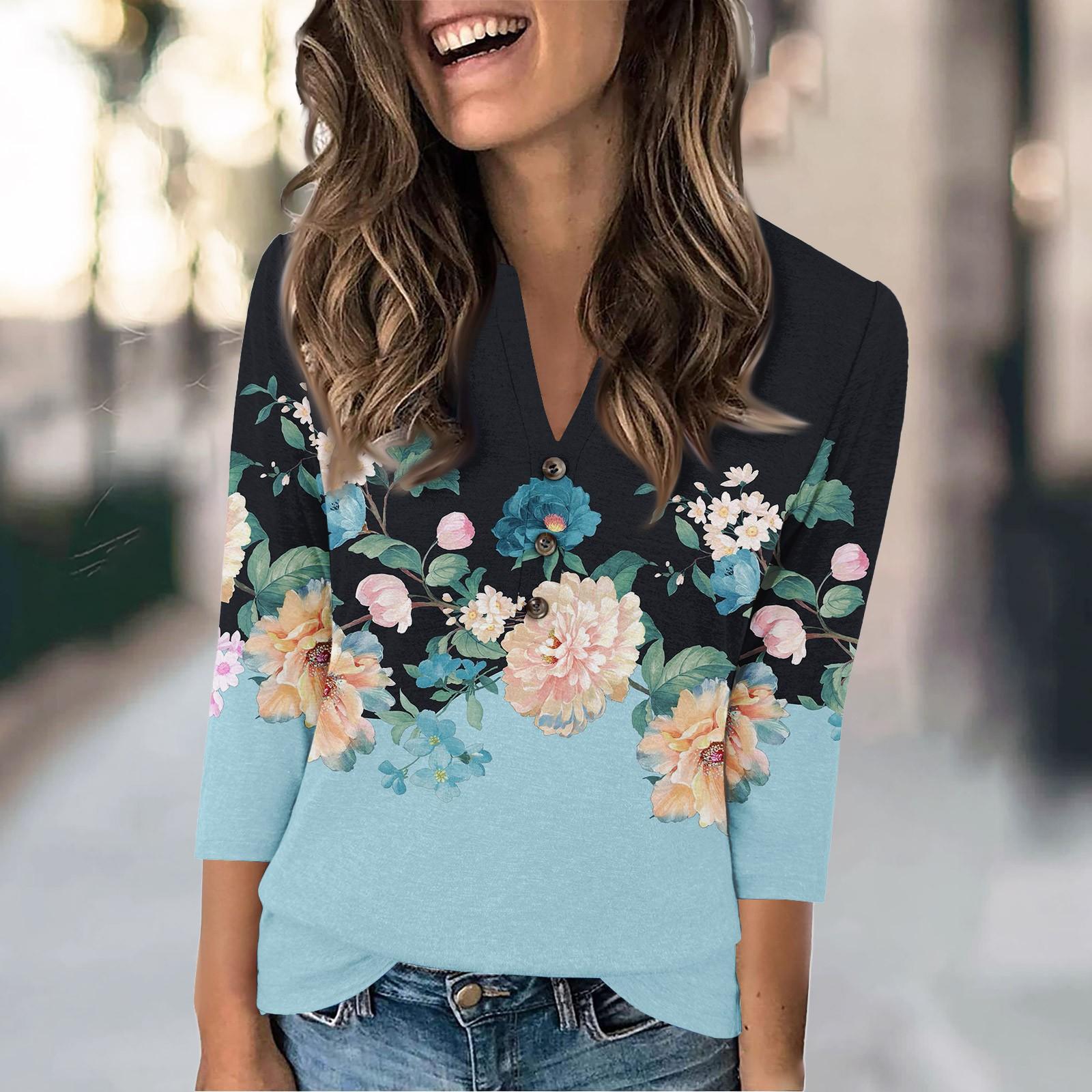 Женская модная повседневная футболка с винтажным цветочным принтом и V-образным вырезом, рукавом 3/4, на пуговицах XXXL