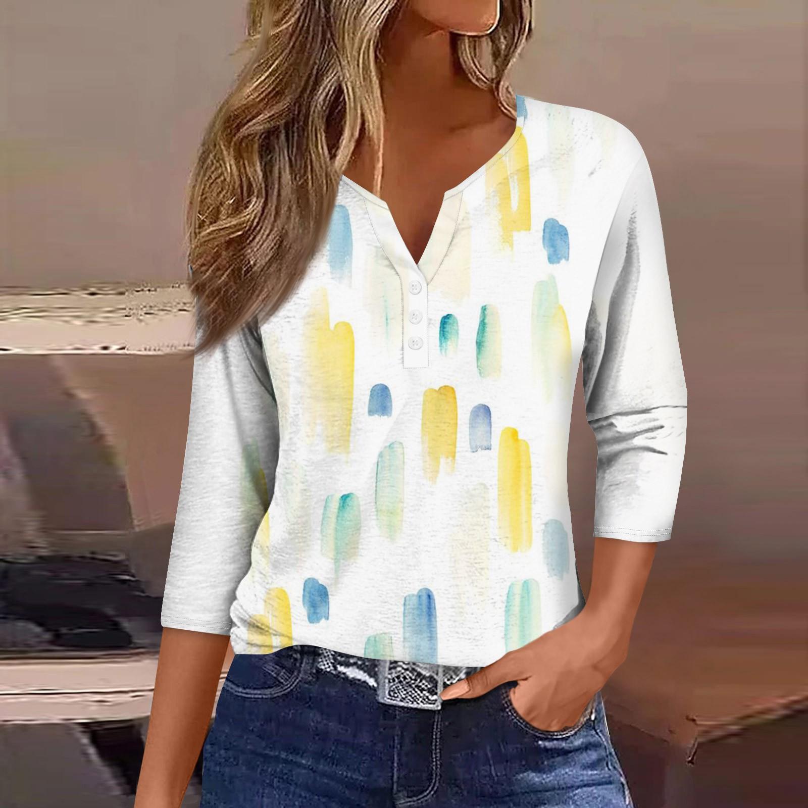 Женская модная повседневная футболка с коротким рукавом и V-образным вырезом, декоративными пуговицами и рукавом три четверти XL белый