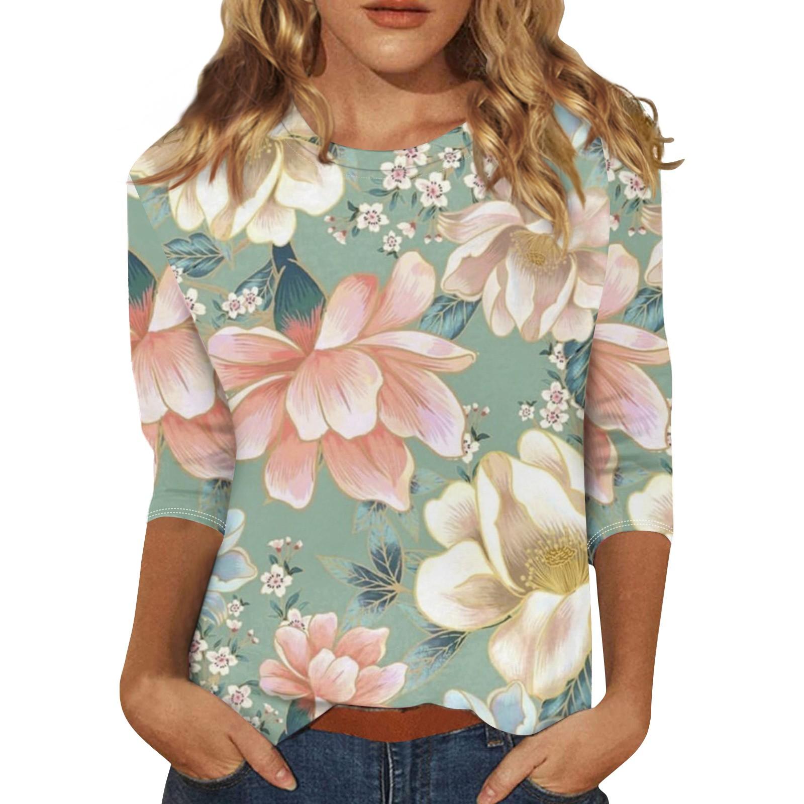 Женская модная повседневная футболка с круглым вырезом и рукавом три четверти с принтом в виде свежего цветка, летние топы для поездок на работу XXL