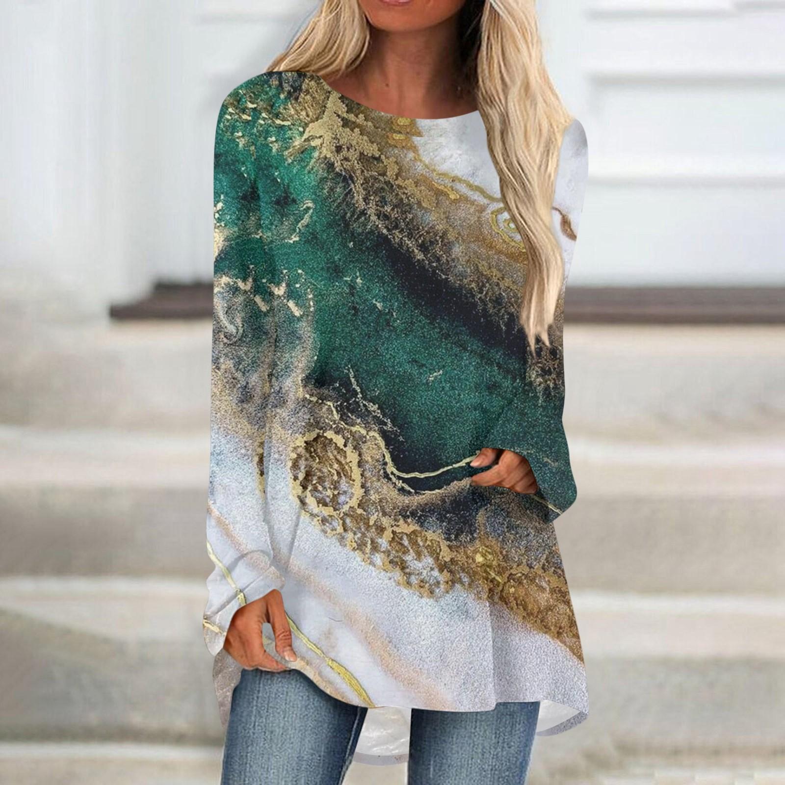 Женская модная повседневная футболка с принтом, длинным рукавом, круглым вырезом, средней длины XL