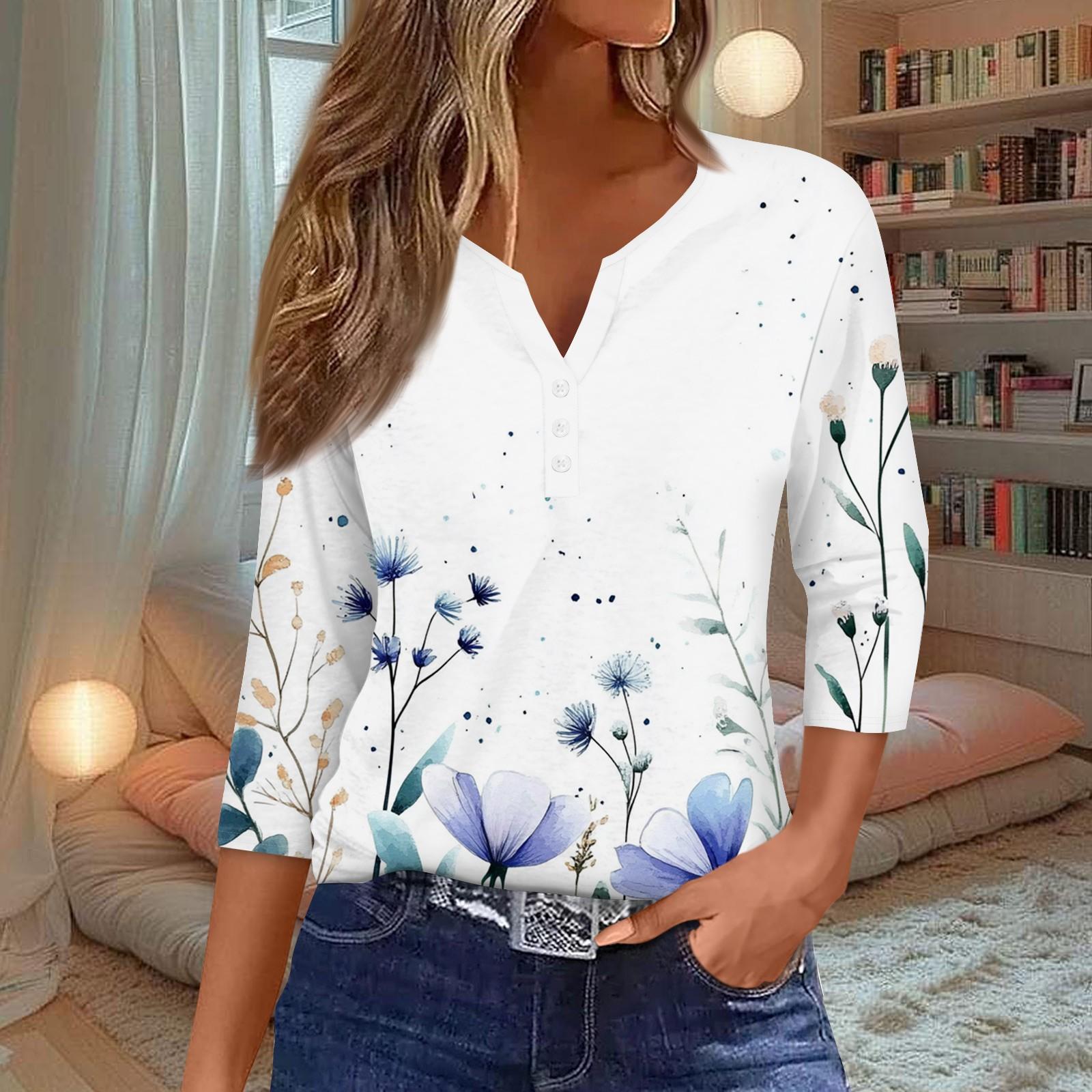 Женская модная повседневная футболка с v-образным вырезом и декоративными пуговицами, рукавом три четверти, с цветочным принтом, топ XL белый