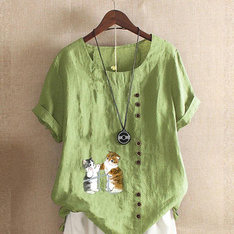 Женская модная футболка с круглым вырезом и коротким рукавом, повседневная рубашка из хлопка и льна с рисунком, свободная летняя блузка с принтом кота, топы 5XL зелёный
