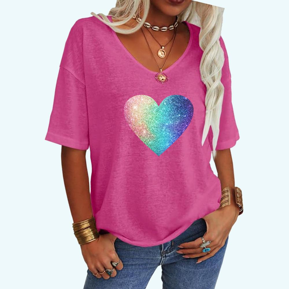 Женская модная футболка с принтом в виде сердца, повседневная свободная футболка с коротким рукавом и V-образным вырезом XXL розовый