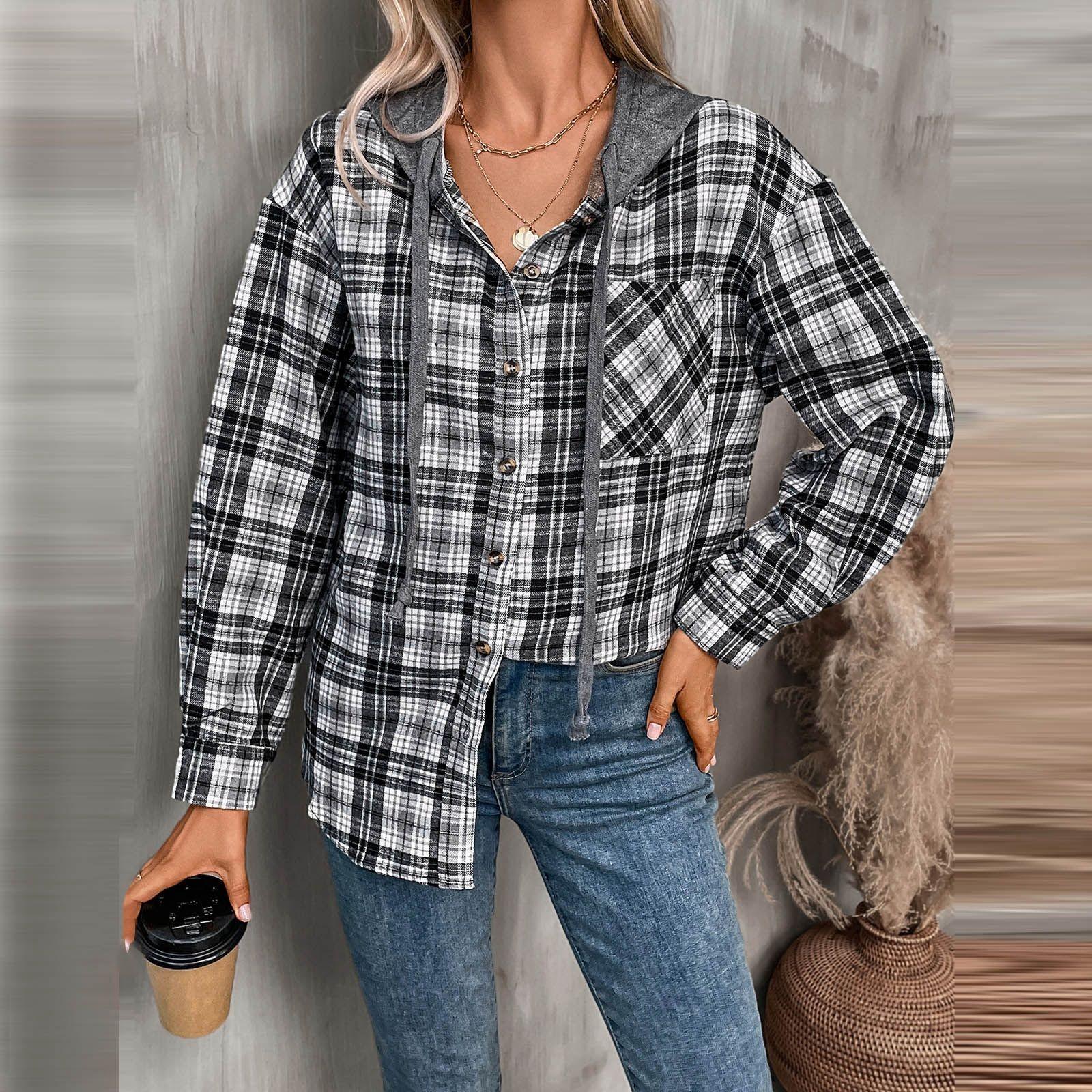 Женская модная широкая клетчатая куртка-рубашка с длинными рукавами и карманами на пуговицах и капюшоном L чёрный