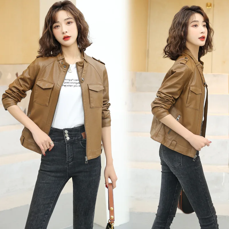 Женская мотоциклетная куртка из натуральной овечьей кожи, с круглым вырезом, на молнии