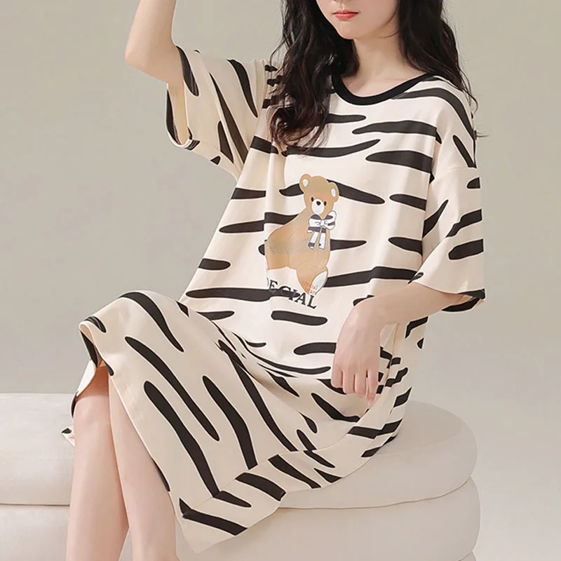 Женская ночная рубашка большого размера, милая повседневная школьная Пижама средней длины с мультяшным медведем, легко моющаяся домашняя одежда для девочек в полоску, цельнокроеное платье