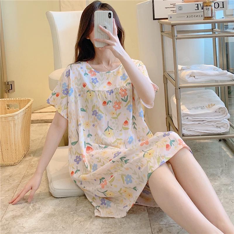 Женская ночная рубашка из хлопка и шелка с мультяшным принтом — короткие рукава, легкая, летняя, пижама больших размеров для дома, весны и осени. One size (suitable for 85-155 lbs)