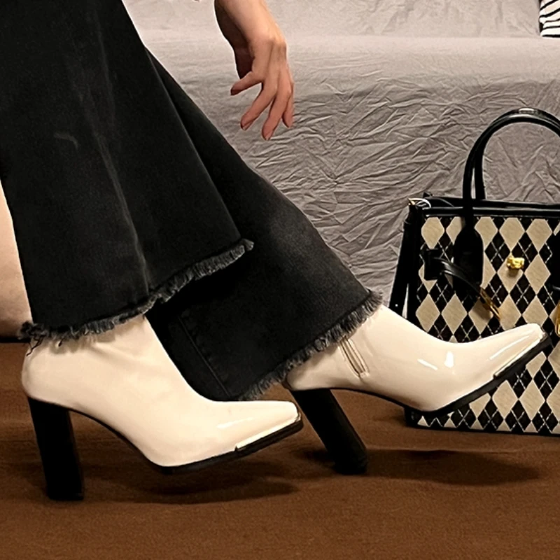 Женская обувь, Лидер продаж, женские ботинки на молнии, зимние однотонные ботинки с квадратным носком на высоком каблуке, модные ботинки на массивном каблуке
