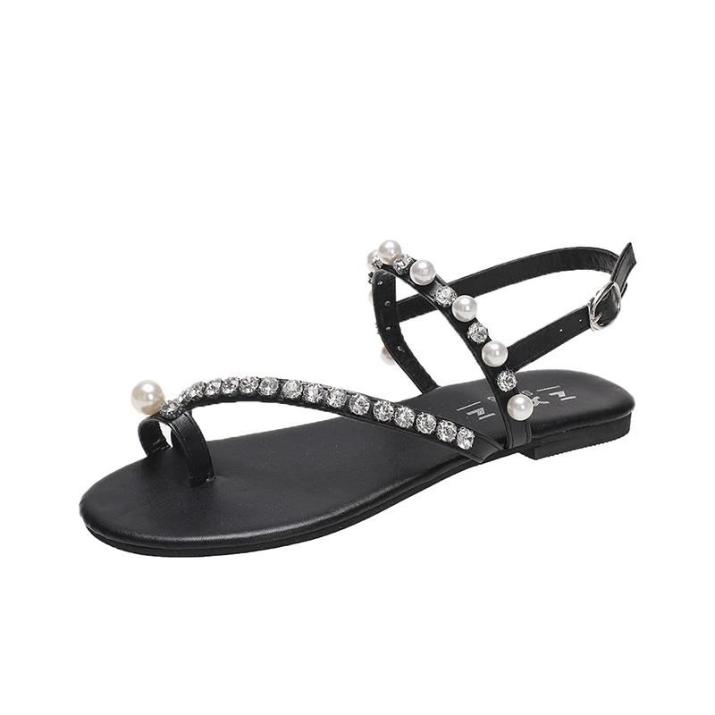 Женская обувь 2024 года, летние новые популярные модные босоножки с открытым носком, женские однотонные босоножки со стразами и пряжкой на плоской подошве Zapatos 43 чёрный