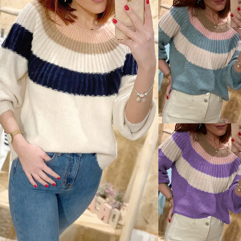 Женская одежда для осени и зимы 2021, новый свитер, повседневный трикотажный свитер контрастных цветов в стиле пэчворк