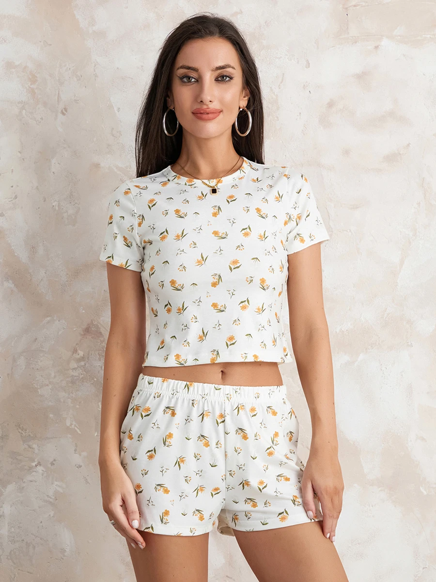 Женская одежда для отдыха из 2 предметов, пижамы, повседневные футболки с коротким рукавом и круглым вырезом, топы, эластичные шорты, комплект для сна, летняя Пижама, Pjs