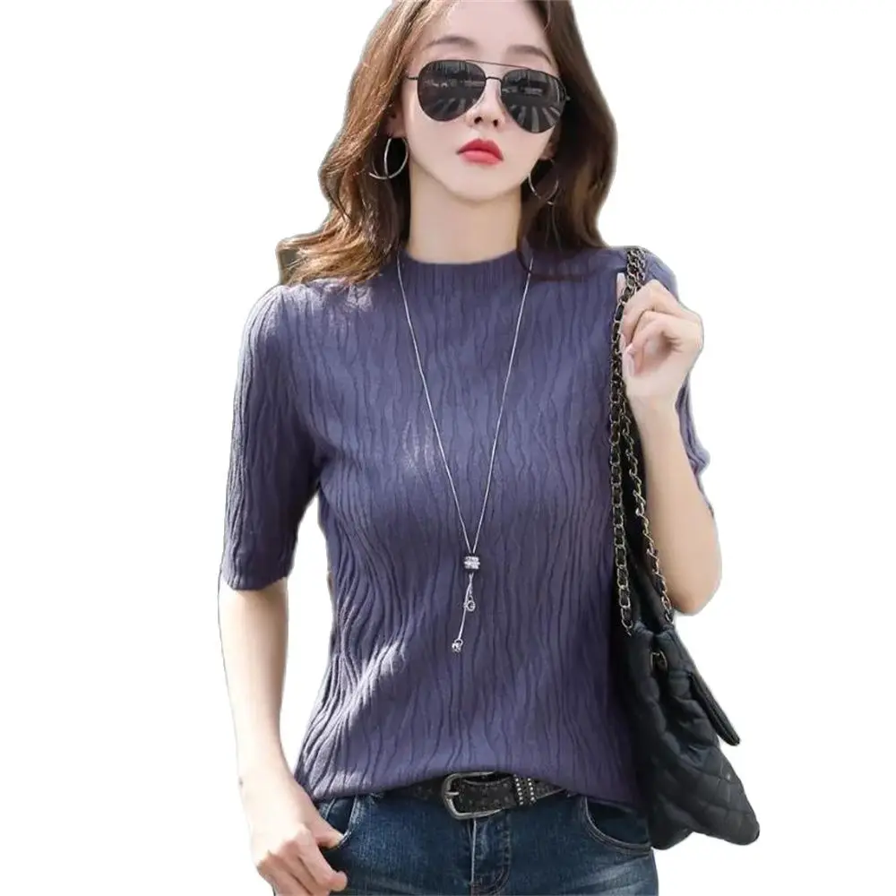 Женская одежда, корейские свитера, облегающие элегантные базовые вязаные футболки, летние универсальные пуловеры с рукавом до локтя, топы, женский джемпер, тонкая одежда