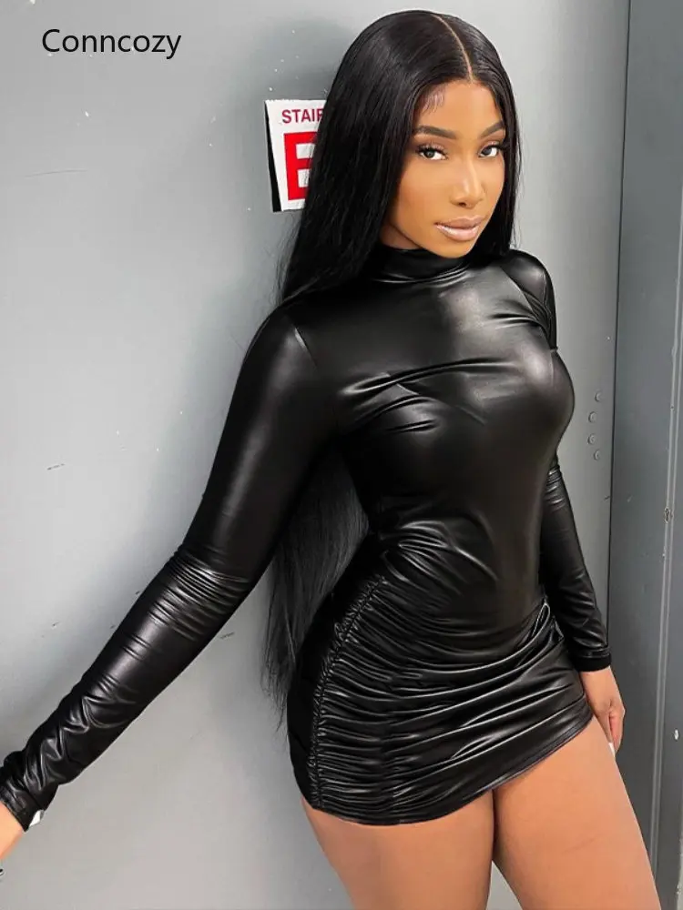 Женская одежда, платья, новинка зимы 2022, модное однотонное кожаное Плиссированное облегающее платье с круглым вырезом и длинным рукавом, се...