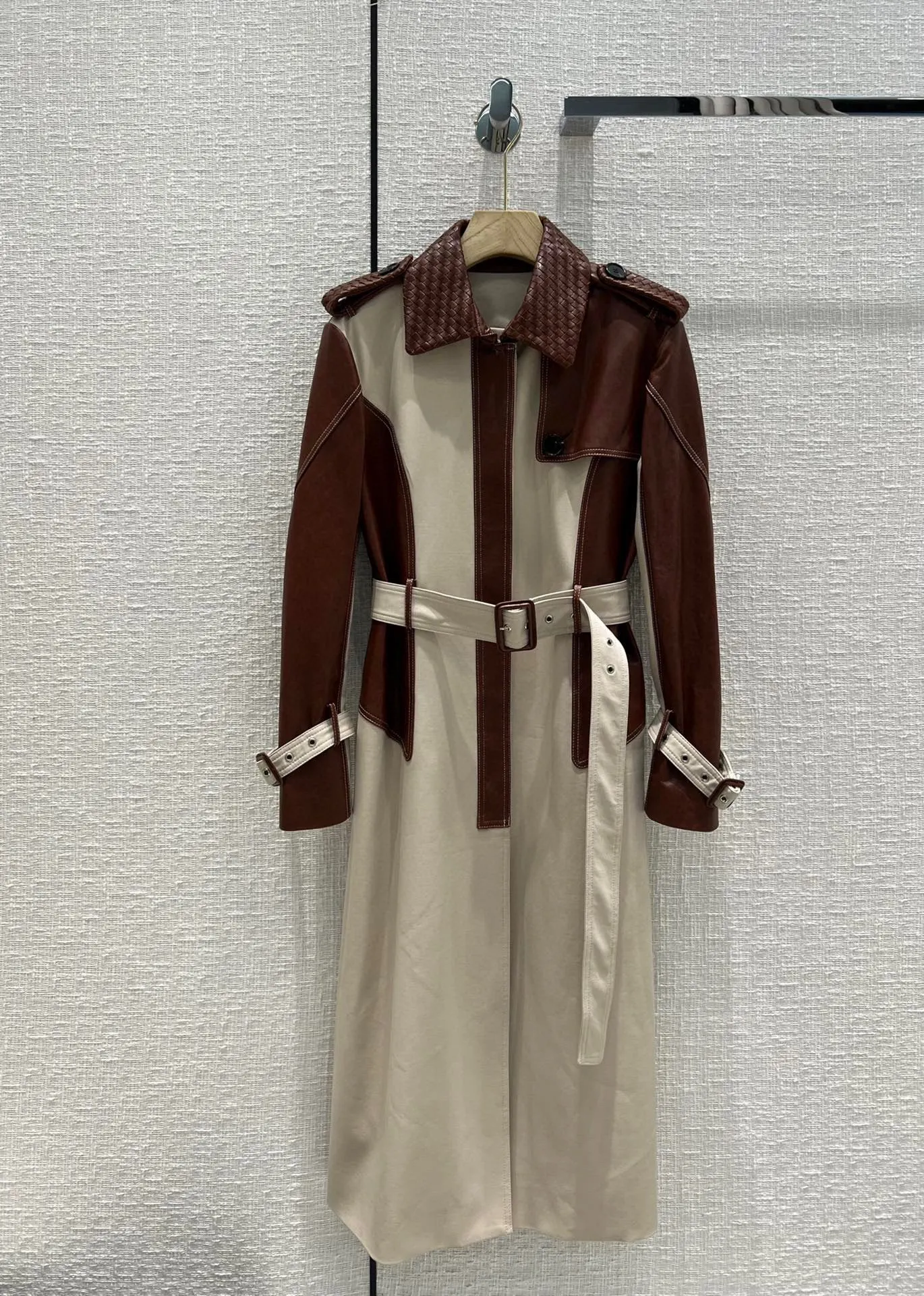 Женская одежда 2023, высококачественный кожаный тренчкот в стиле пэчворк с тканым воротником, новинка на осень-зиму 16
