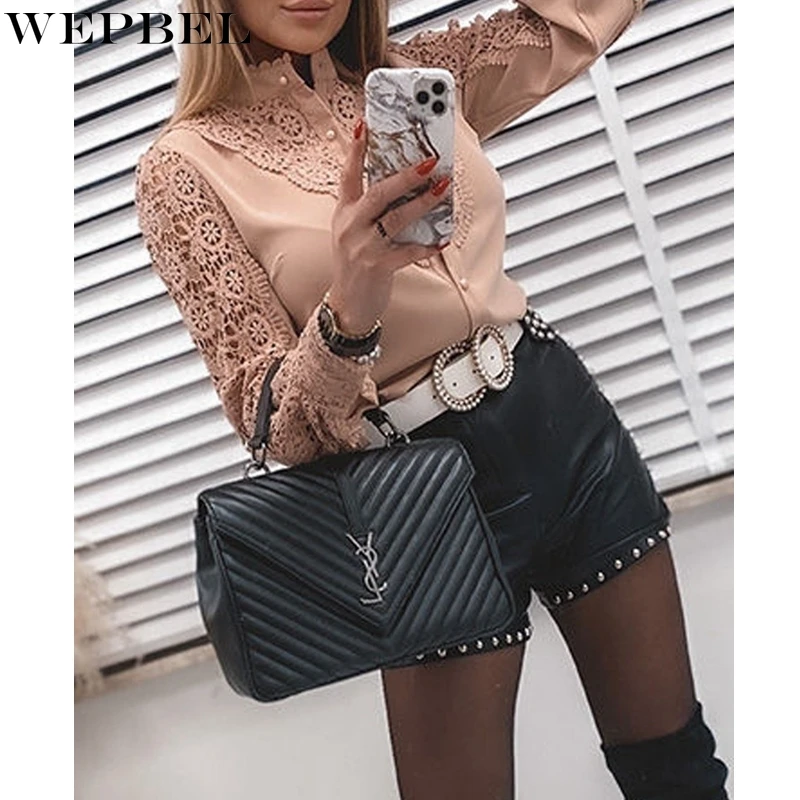Женская однобортная кружевная рубашка WEPBEL, однотонная Облегающая рубашка с длинным рукавом и воротником-стойкой, с вырезами, на лето