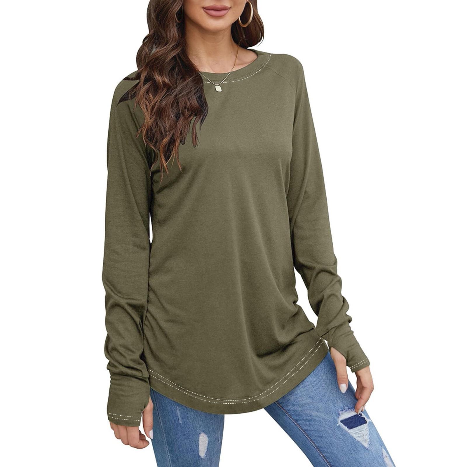 Женская однотонная свободная футболка с круглым вырезом и длинными рукавами средней длины, топ с дырявым большим пальцем L армия зеленый